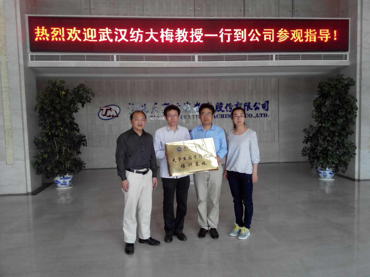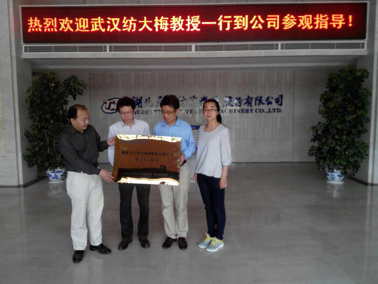 武漢紡織大學(xué)攜手天門紡機建立湖北省研究生工作站和大學(xué)生實習(xí)與就業(yè)基地(從左至右依次為院長梅順齊、執(zhí)行院長燕怒、總工程師鄭強、辦公室主任李靜)