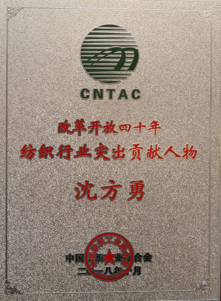沈方勇董事長(zhǎng)獲改革開放40年紡織行業(yè)突出貢獻(xiàn)人物稱號(hào)