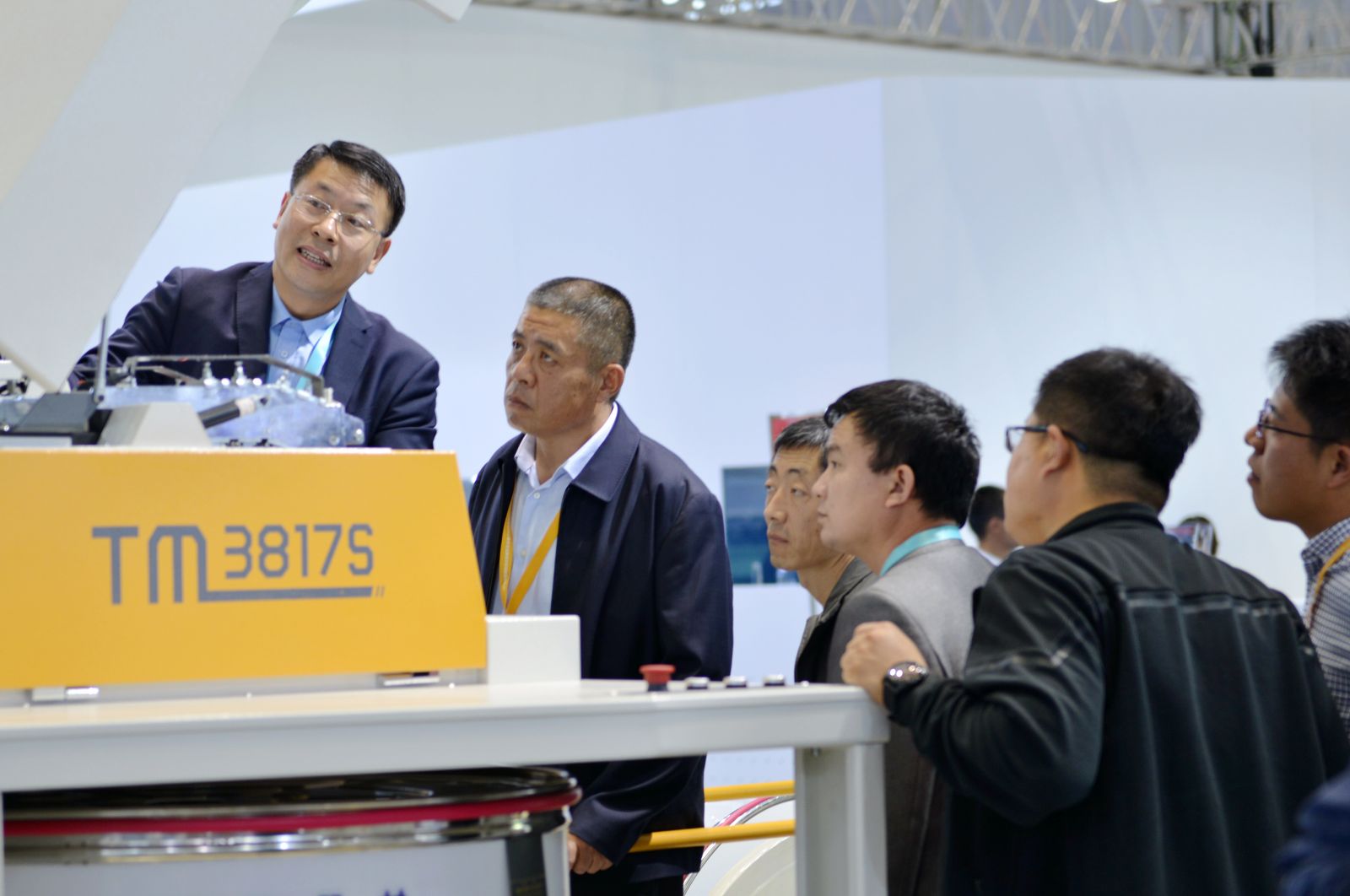 公司董事長沈方勇向中紡聯(lián)原會長杜鈺洲(右3)、中國紡織機械協(xié)會會長王樹田(右2)介紹參展新產(chǎn)品特點