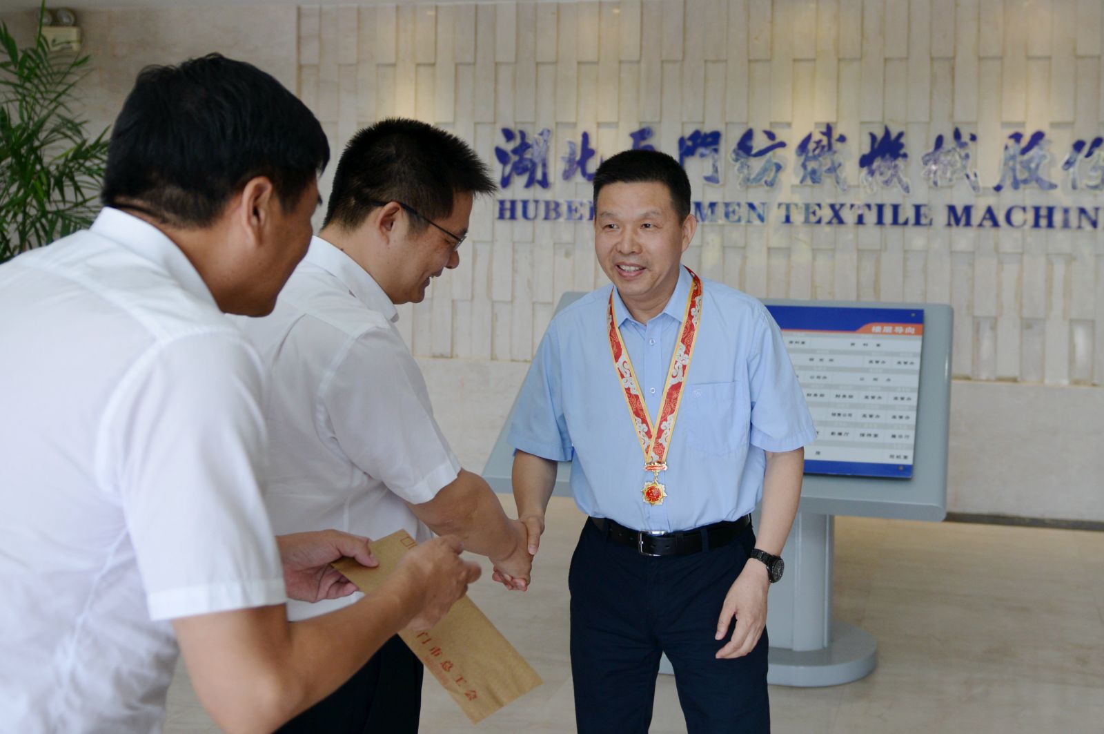 9月30日上午,天門市委、市政府及總工會(huì)相關(guān)領(lǐng)導(dǎo)來(lái)到天門紡機(jī),為董事長(zhǎng)沈方勇頒發(fā)由中共中央、國(guó)務(wù)院、中央軍委授予的“慶祝中華人民共和國(guó)七十周年”紀(jì)念章,并與沈方勇董事長(zhǎng)親切合影留念。