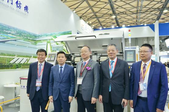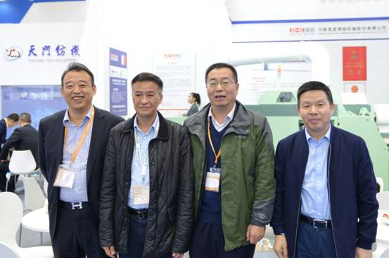 中紡聯(lián)黨委書記、秘書長高勇(左3)、中紡聯(lián)副會長楊紀(jì)朝(右2)、中國紡織機(jī)械協(xié)會總工程師祝憲民(左1)在天門紡機(jī)展位上合影