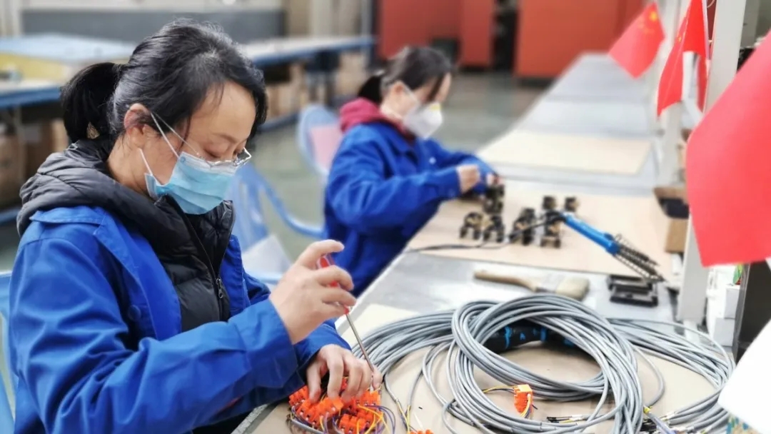 紡電員工李莉、徐艷華根據(jù)發(fā)貨型號機型進行電器零部件配套整理