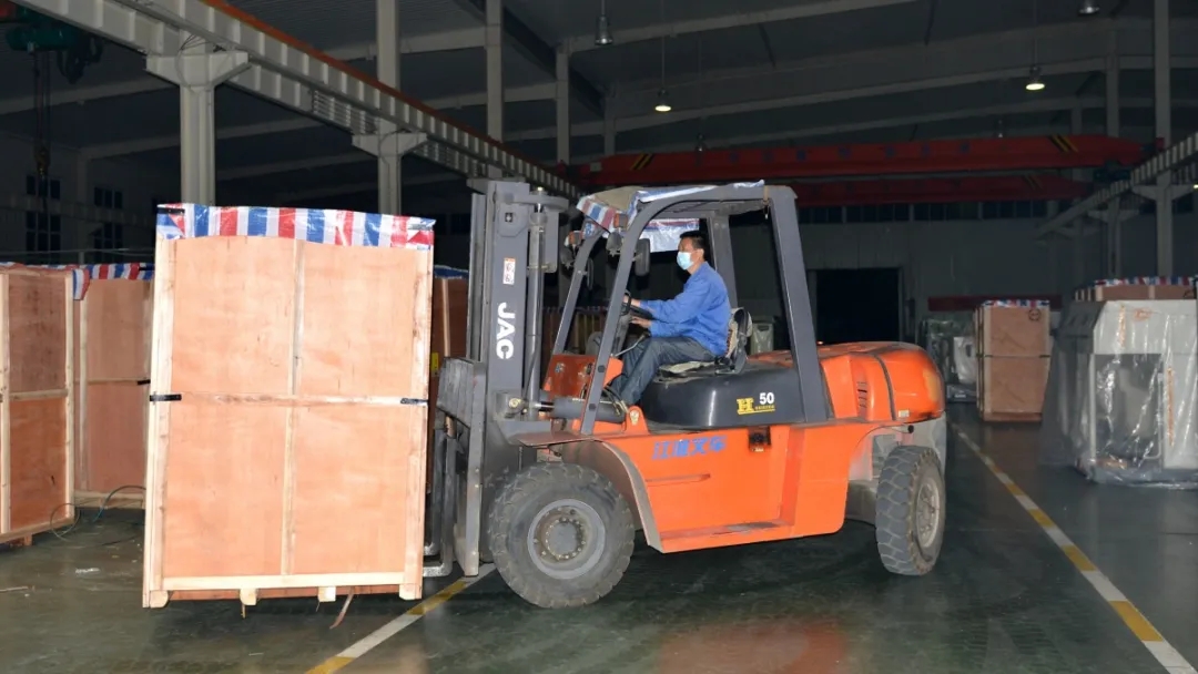 夜幕降臨,公司叉車司機姚順華抓緊時間將包裝好的產(chǎn)品進行裝車作業(yè)