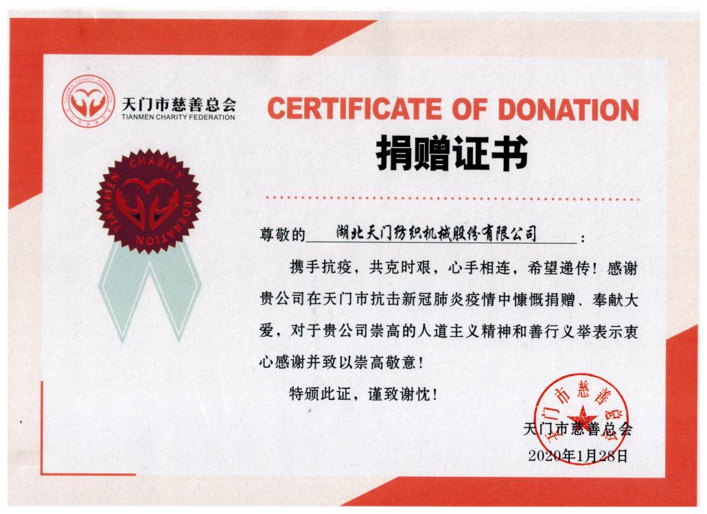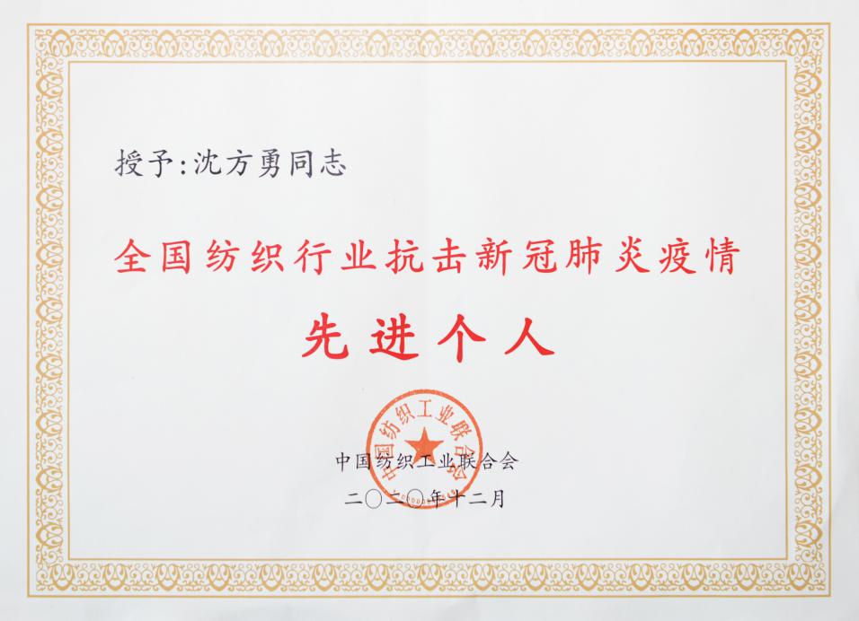 近日,中國紡織工業(yè)聯(lián)合會下發(fā)《關(guān)于表彰全國紡織行業(yè)抗擊新冠肺炎疫情先進(jìn)集體和先進(jìn)個人的決定》,天門紡機(jī)董事長沈方勇獲評“全國紡織行業(yè)抗擊新冠肺炎疫情先進(jìn)個人”。