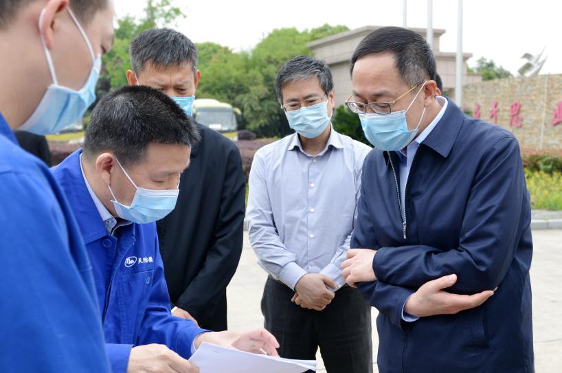 沈方勇董事長向國家衛(wèi)健委副主任于學(xué)軍(右1),國家衛(wèi)健委衛(wèi)生應(yīng)急辦公室監(jiān)察專員張國新(右2)等領(lǐng)導(dǎo)匯報天門紡機(jī)復(fù)工復(fù)產(chǎn)疫情防控情況