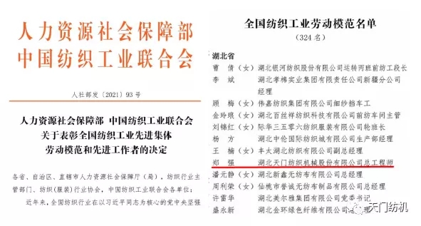 為表彰獎(jiǎng)勵(lì)一批為國(guó)家紡織工業(yè)做出突出貢獻(xiàn)的先進(jìn)集體和個(gè)人,近日,人力資源社會(huì)保障部、中國(guó)紡織工業(yè)聯(lián)合會(huì)決定(人社部發(fā)【2021】93號(hào)文),表彰全國(guó)紡織工業(yè)先進(jìn)集體、勞動(dòng)模范和先進(jìn)工作者,天門(mén)紡機(jī)總工程師鄭強(qiáng)被授予“全國(guó)紡織工業(yè)勞動(dòng)模范”榮譽(yù)稱(chēng)號(hào)。