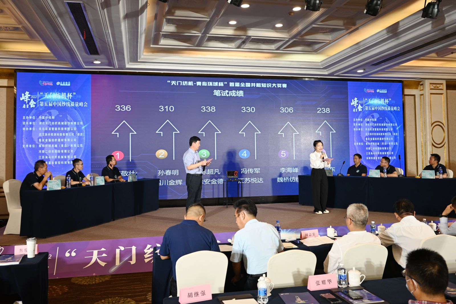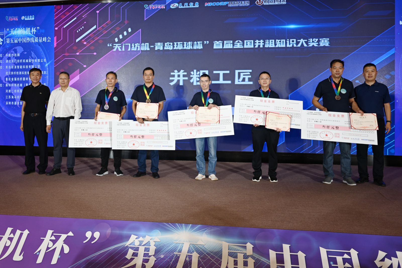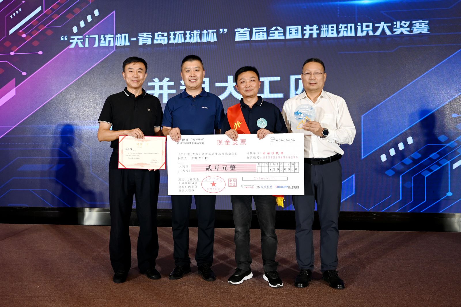 這是一場別開生面的競賽學習活動,6位選手的精彩表現(xiàn)不斷地贏得熱烈的掌聲,江蘇悅達馮傳軍以888分獲得“天門紡機-青島環(huán)球杯”首屆全國并粗知識大獎賽-爭霸賽冠軍,為歷時3個月的大賽活動劃上圓滿的句號?,F(xiàn)場爭霸賽結束后,隆重舉行了頒獎活動,現(xiàn)場頒發(fā)“企業(yè)優(yōu)秀組織獎”、“并粗工匠獎”、“并粗大工匠獎”。天門紡機副總經(jīng)理肖少華、賽特環(huán)球營銷總監(jiān)陳濤、中國紗線網(wǎng)總裁鞠彥軍為大賽活動致辭并頒獎。