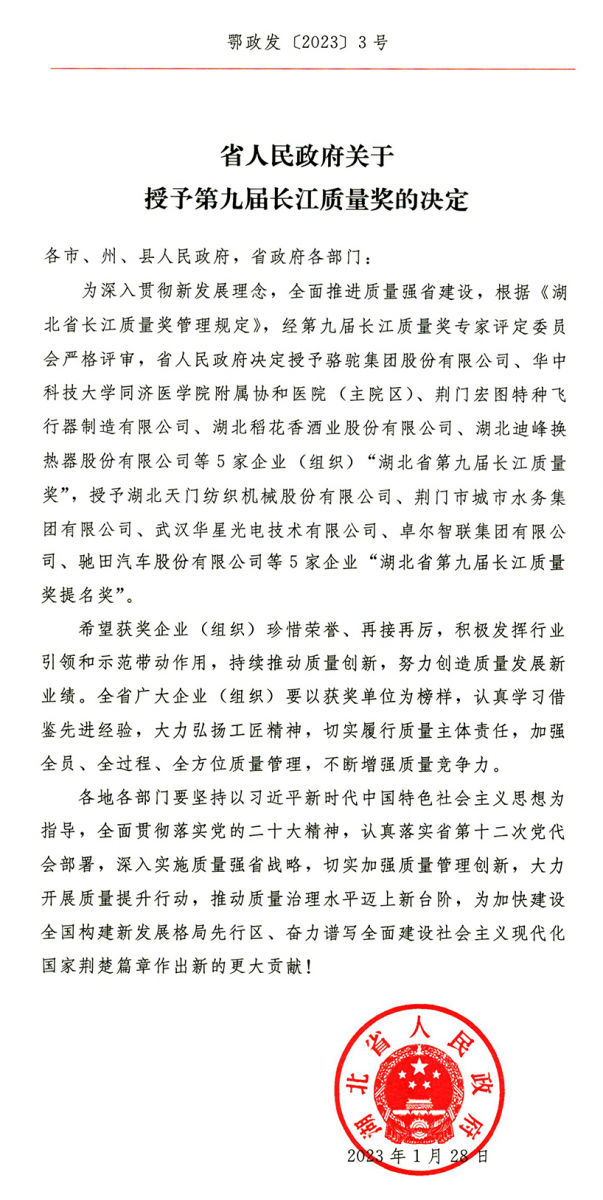 近日,湖北省人民政府以鄂政發(fā)(2023)3號文頒發(fā)《關于授予第九屆長江質量獎的決定》。天門紡機榮獲“湖北省第九屆長江質量獎提名獎”,受到省政府表彰。