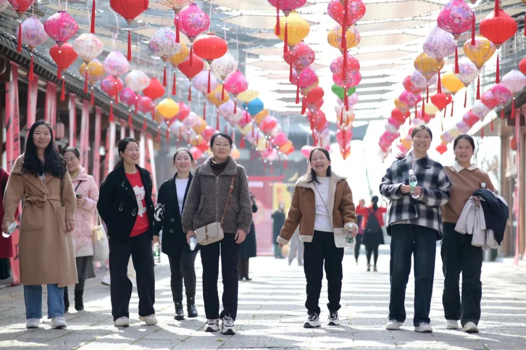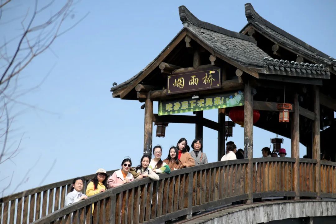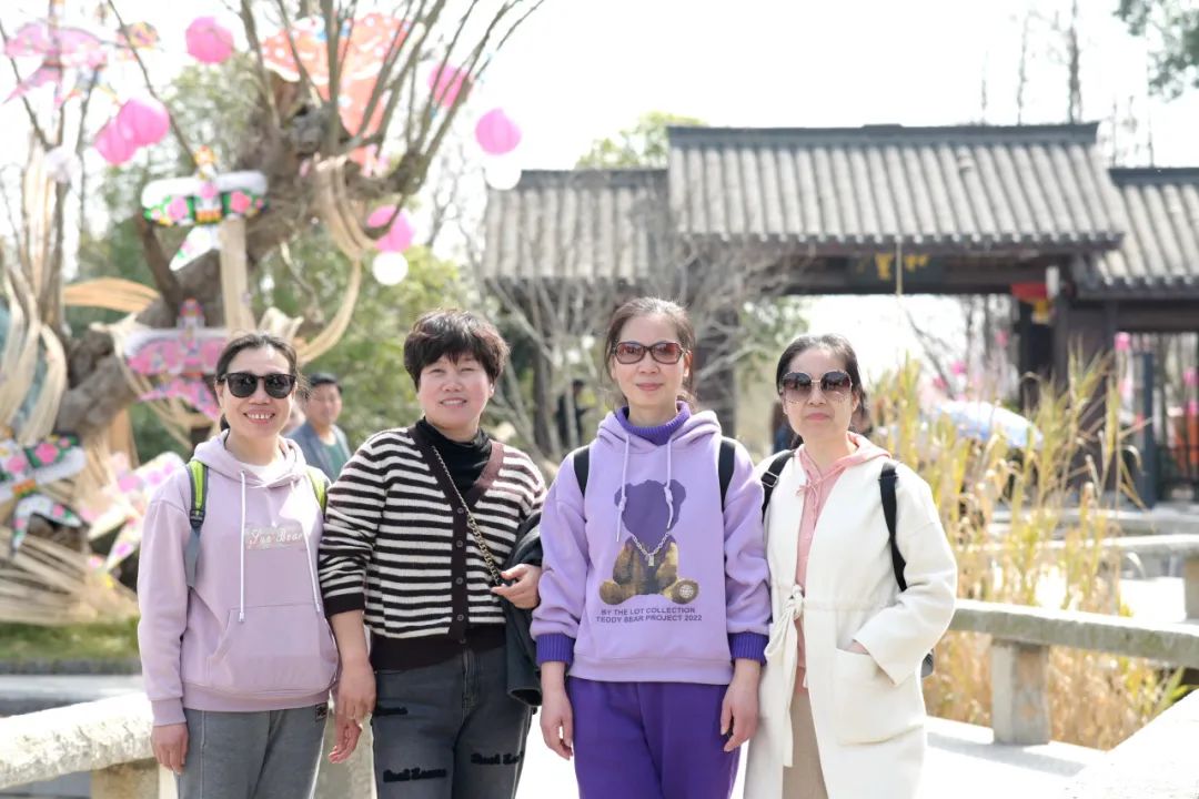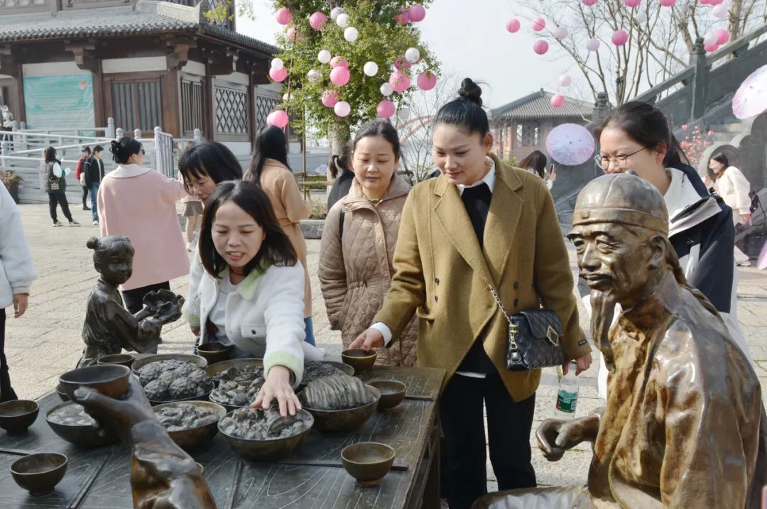 游覽過程中,女工們有的參觀小鎮(zhèn)書院,了解當(dāng)?shù)氐臍v史文化;有的在小銅人雕塑旁合影留念,定格美好時光;有的登上文昌閣遠眺,感受湖光山色。