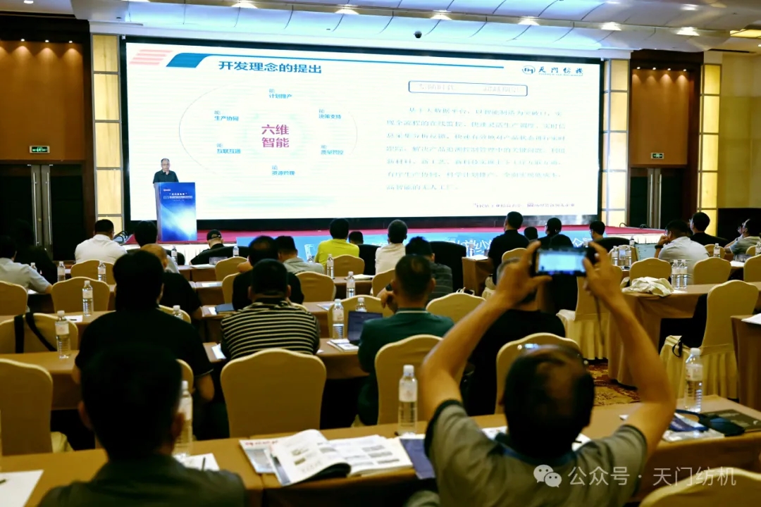 在技術(shù)交流環(huán)節(jié)中,天門紡機品控總監(jiān)樊早斌作了題為《六維智能開創(chuàng)并條產(chǎn)線聯(lián)動新時代》的主旨報告。他深入闡述了產(chǎn)線聯(lián)動的理念、研發(fā)背景和思路,詳實介紹了基于六維智能的并條創(chuàng)新技術(shù)以及產(chǎn)線聯(lián)動的實踐應用與開發(fā)進程。他強調(diào),“六維智能”開發(fā)理念的提出是基于大數(shù)據(jù)平臺,其創(chuàng)新點就是以智能制造為突破口,實現(xiàn)全流程的在線監(jiān)控、快速靈活生產(chǎn)調(diào)度、實時信息采集分析反饋,快速有效地對產(chǎn)品狀態(tài)進行實時跟蹤,解決產(chǎn)品追溯控制管理中的關(guān)鍵問題;利用新材料、新工藝、新科技實現(xiàn)上下工序互聯(lián)互通,有序生產(chǎn)協(xié)同,科學計劃排產(chǎn),全面實現(xiàn)低成本、高智能的無人工廠。
