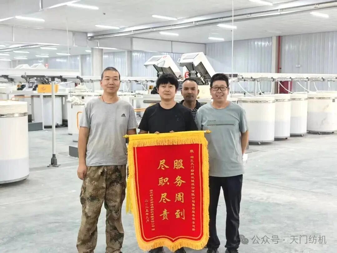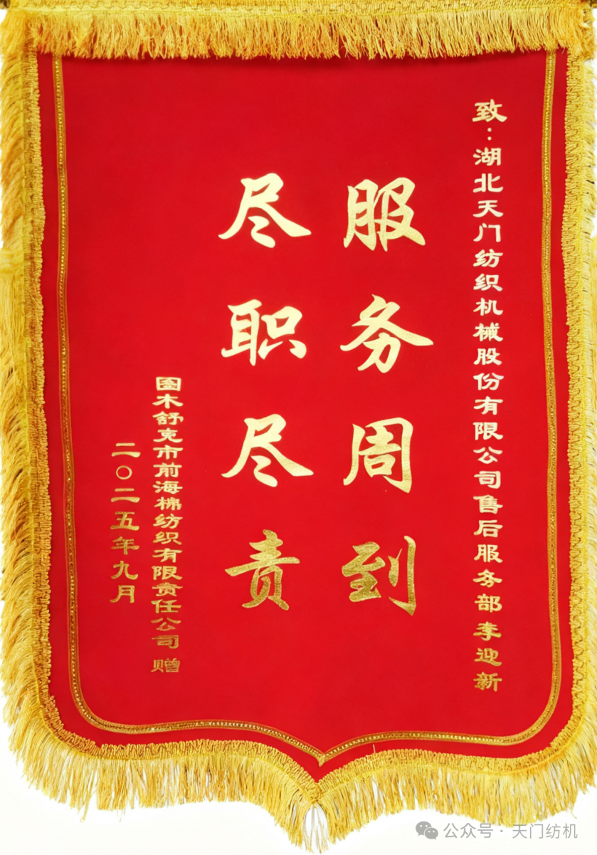 “服務(wù)周到,盡職盡責(zé)”,這是天門紡機(jī)新疆客戶圖木舒克市前海棉紡織有限責(zé)任公司送給90后售后服務(wù)工程師李迎新的錦旗贈言。短短八個(gè)字,既是肯定,又是褒揚(yáng)。